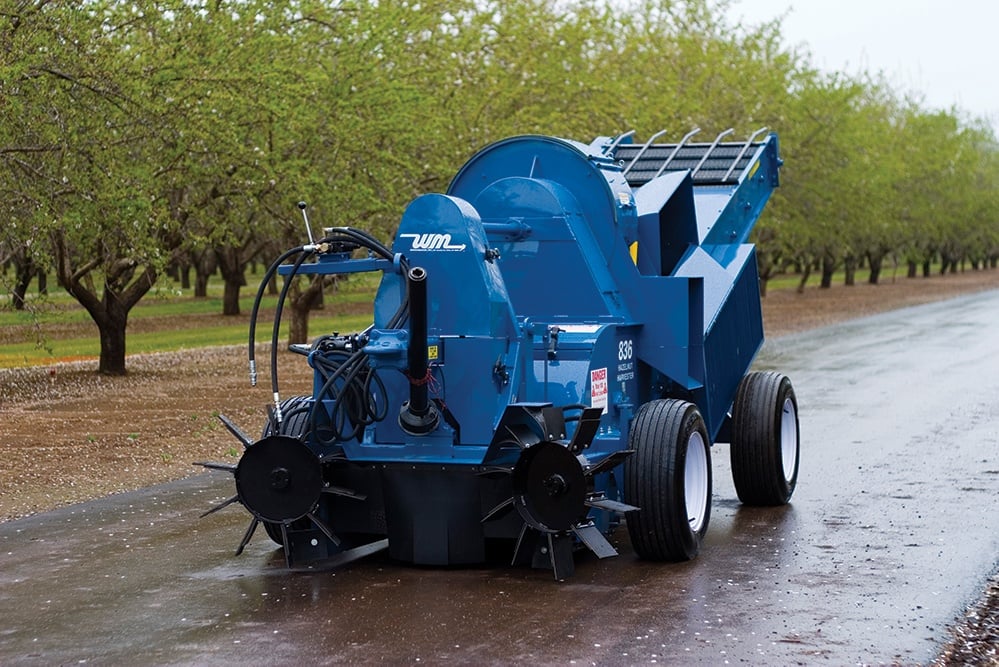 The 836 Hazelnut Harvester is designed specifically for the unique conditions of the hazelnut industry. The optional elevator mud brush keeps the chain free of mud to allow for increased air flow; the front feed paddle wheels prevent leaf pile-up in front of the side plates; a new leaf hood has increased the air velocity, resulting in an increased cleaning efficiency; and the vacuum, which has an easy access hinged opening and a larger trash capacity, allows for faster ground speed.